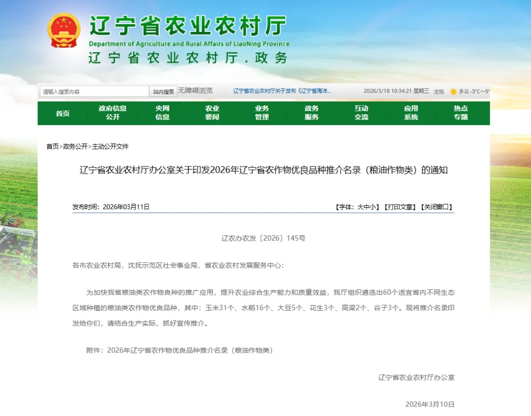 近日,遼寧省農(nóng)業(yè)農(nóng)村廳發(fā)布了2026年遼寧省農(nóng)作物優(yōu)良品種推介名錄,遼寧東亞種業(yè)自主培育的東單1331、東科1188、豐平108入選2026年遼寧省農(nóng)業(yè)主導(dǎo)品種。